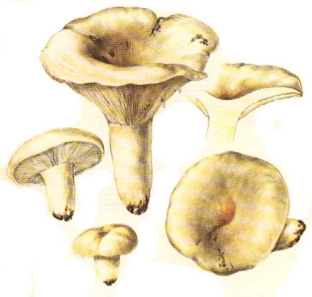 Cap convex, then depressed and also funnel shaped, 6-20 cm; smooth, regular; sometimes slightly cracked in dry air; margin rolled toward the gills, then explanate and undulate; white, then whitish, with hazel stains; always white along the margin. Stem squat, sometimes shaped as an inverted cone; white with reddish or greenish shades. Flesh hard, cream colored, becoming slowly greenish when exposed to air. Odor soft. Flavor slightly acrid. Latex abundant, syrupy, white then slowly greenish; very acrid flavor. Gills very close, thin, narrow; the bifid ones numerous; decurrent along the stem; white with ochraceous hues; then pale cream, stained green by the latex; spotted with brown where bruised. Spores white. It grows in shady and humid recesses in the woods; in large groups, in rows or in circles. Not advisable: in some regions it is eaten cooked on the grill; in others after it has been exsiccated; still in other regions, dried and reduced to powder, as seasoning; in others in small doses, fresh, in place of hot pepper; even cooked after parboiling it is left with a questionable taste of laundry soap and is difficult to digest. More common than the above and similar to it is Lactarius pergamenus, not edible: gills very close and narrow, stem long, cap not too fleshy, white, then yellowish and rugose, flesh that tends to become yellowish, and latex white not changing even in contact with air. All the lactarii that are neither acrid nor bitter are edible, since they are not poisonous; but they are not always tasty.